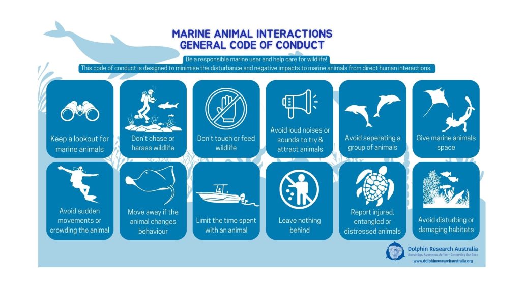 There are Dolphin Watching Regulations in place throughout Australian waters which include restrictions on approach distances and acceptable behaviour of vessels (including motorised, sail, kayaks and personal craft), swimmers and aircraft (including drones).