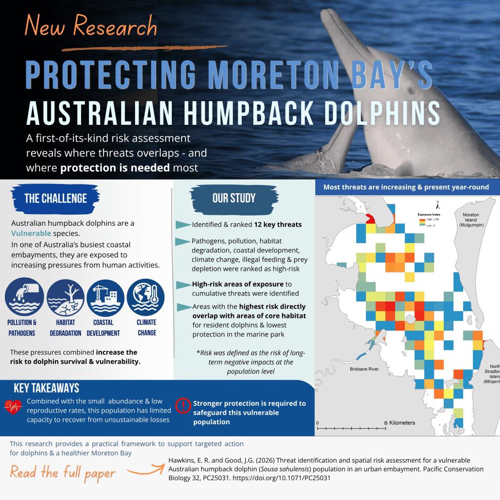 As coastal pressures intensify globally, this research provides a practical framework to guide targeted and adaptive conservation management — both here in Moreton Bay and for vulnerable coastal dolphin populations worldwide.